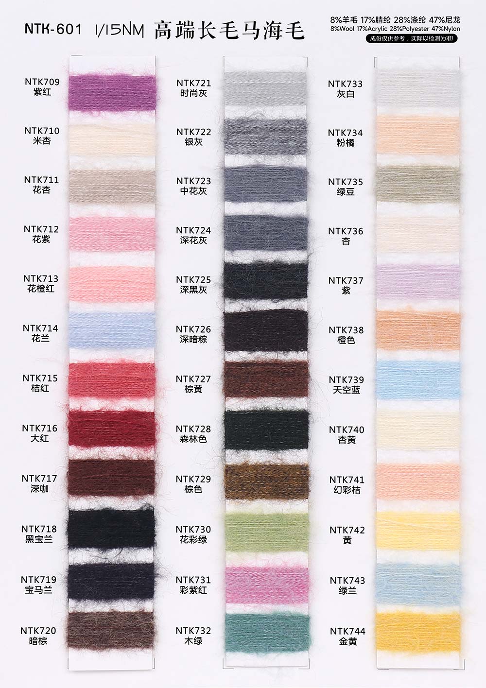 8%羊毛Wool 17%腈纶Acrylic 28%涤纶Polyester 47%尼龙Nylon